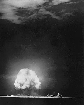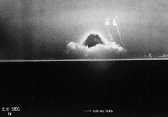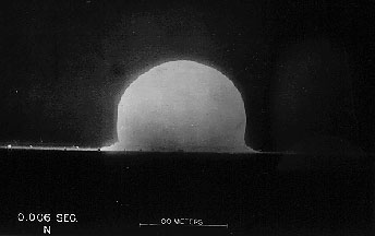 The Trinity Site explosion: At .006 seconds... .016 seconds .025 seconds .053 seconds At 2 seconds, the flash gives way to a blast wave ... 4 seconds At 15 seconds, it becomes a mushroom cloud. |