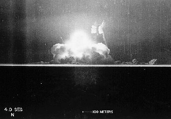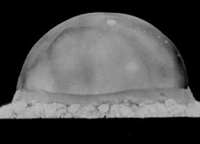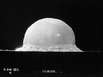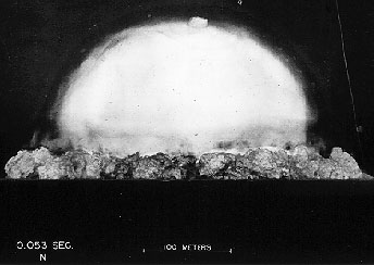 The Trinity Site explosion: At .006 seconds... .016 seconds .025 seconds .053 seconds At 2 seconds, the flash gives way to a blast wave ... 4 seconds At 15 seconds, it becomes a mushroom cloud. |